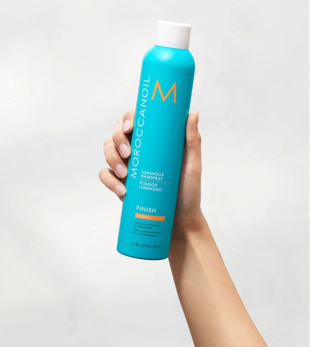 Hold Moroccanoil® Luminous Hairspray can 10 inches (25 cm) from hair and spray for strong hold.